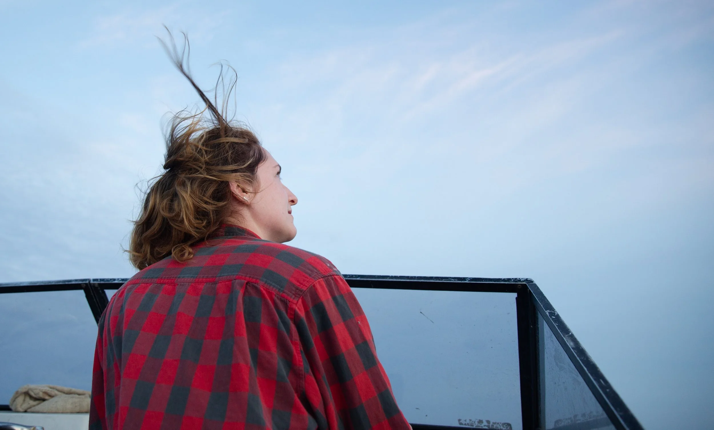 Thistle Swann drives her family’s boat alongside her brother, Sam Swann, to their summer home on Gotts Island on June 27, 2020.