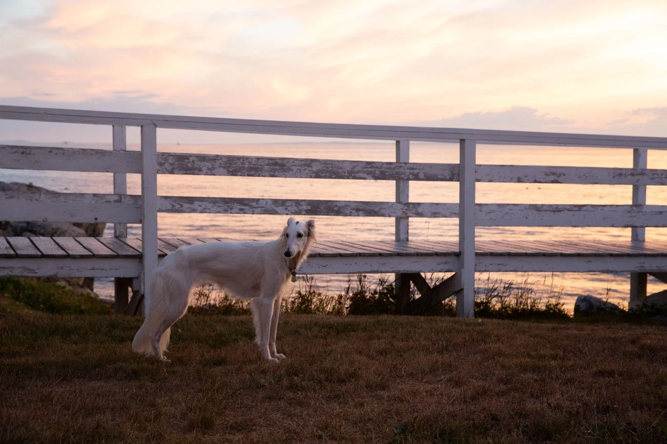 Obie, Thistle Swann’s Sealyham Terrier, runs from a nearby trail on Gotts Island on June 28, 2020.