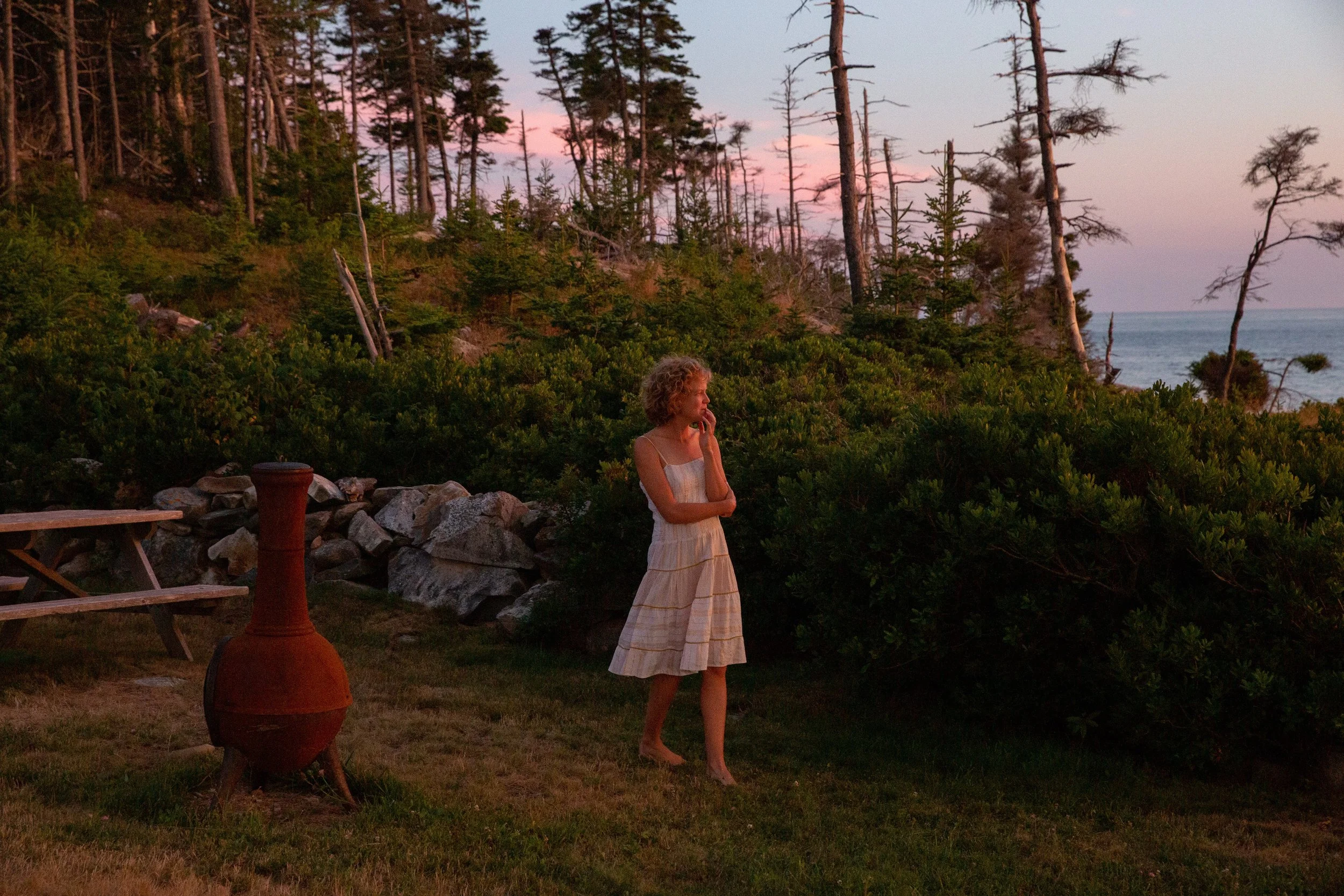 Annabelle, an Isle Au Haut visitor, watches the sunset from the Isle Au Haut Lighthouse on August 12, 2020.